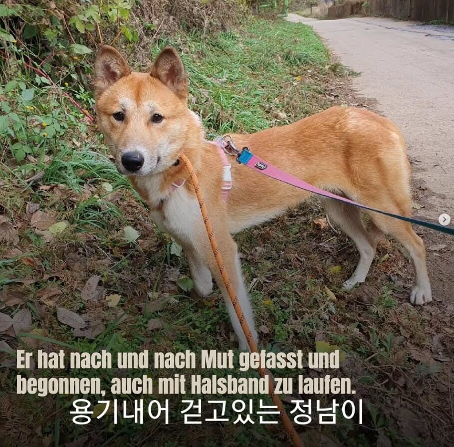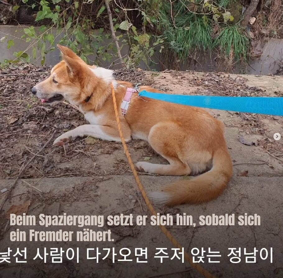 Jeognam gehört nicht zu den Hunden , die aktiv Körperkontakt zu ihrem Menschen suchen. Fremde Menschen ängstigen ihn noch und er geht diesen aus dem Weg und versucht sich zu verstecken. Personen die er regelmäßig sieht werden akzeptiert. Er ist der stille Begleiter, der viel Zeit zum Vertrauensaufbau benötigt. Momentan wird an weiterer Sozialisierung gearbeitet und Jeo macht gute Fortschritte. Jeo hat das Vertrauen in Menschen noch nicht verloren, obwohl das keine Wunder wäre, wenn er Menschen verabscheuen würde. Es gibt eine Rettungsgeschichte. Jeo sollte im Kochtopf landen.