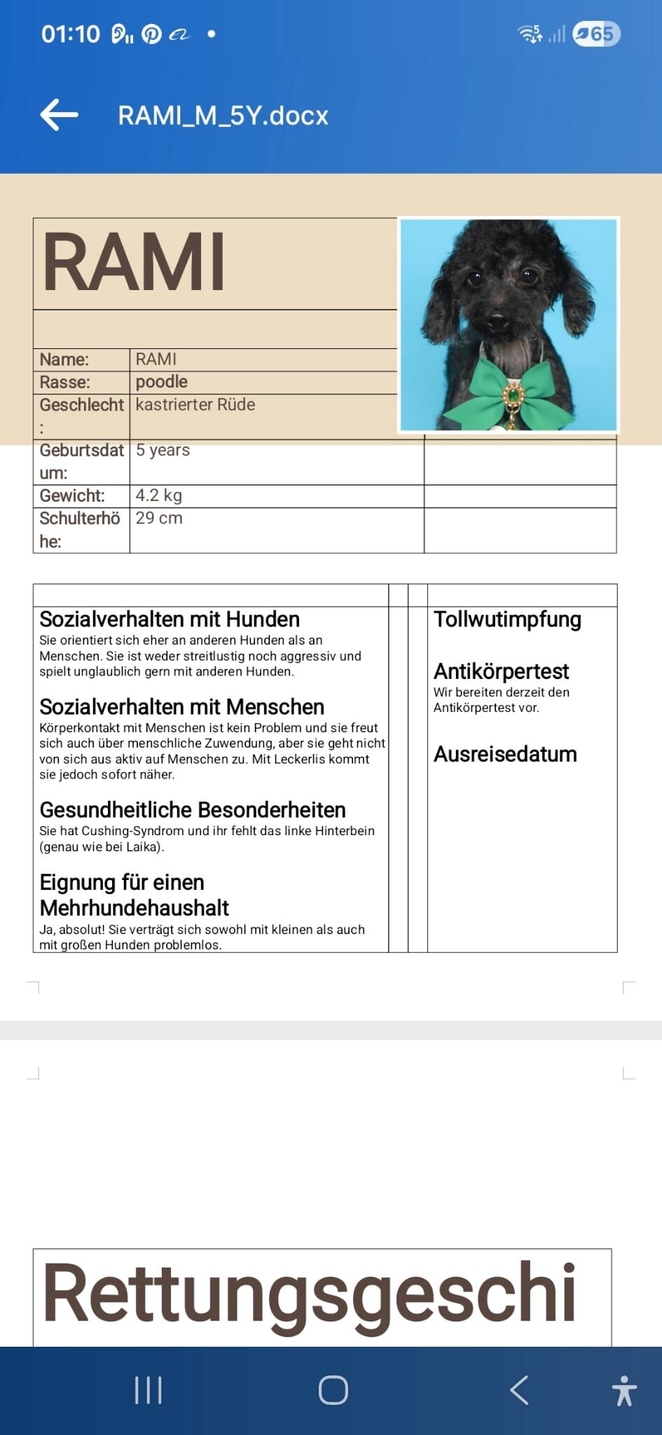 Rami orientiert sich eher an anderen Hunden als an Menschen. Er ist weder streitlustig noch aggressiv. Er spielt unglaublich gut mit anderen Hunden. Körperkontakt mit Menschen ist kein Problem und er freut sich über menschliche Zuwendung, aber er geht nicht aktiv auf Menschen zu, das muss Rami erst noch lernen. Mit Leckerli kommt er jedoch sofort näher. Daher wäre Rami gut in einen Mehrhundehaushalt integrierbar. Leider musste krankheitsbedingt, er stammt ja aus einer schlimmen Vermehreranstalt, ein Füßchen abgenommen werden, was Rami aber nicht sehr beeinträchtigt. Ein gesundheitliches Problem hat Rami, er leidet unter dem Cushing-Syndrom. Diese muss überwacht und weiter behandelt werden. Es gibt dazu Instruktionen, bei Interesse an Rami.